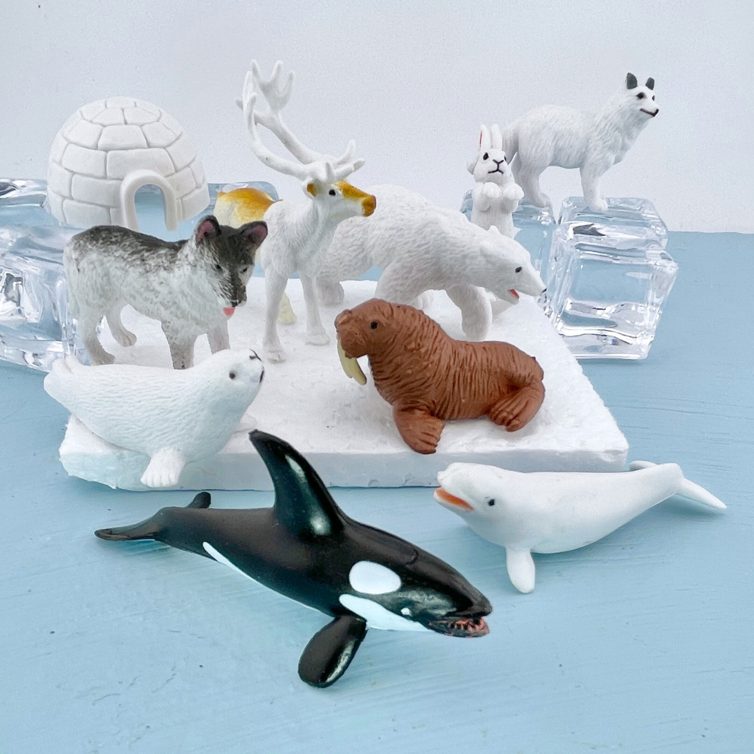 Pack your warmest clothes, because you’re going on an adventure to observe some of the Arctic’s most unique animals! This Toob includes a harp seal, husky, caribou, Arctic rabbit, killer whale, walrus, Arctic fox, beluga whale, polar bear, and an igloo for you to stay in.