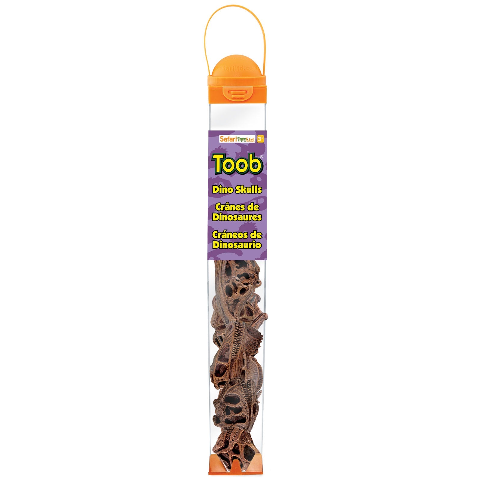 Size: Our Dinosaur Skulls Toob toy set measures 1.5 inches long, 1.5 inches wide, and 12.8 inches tall, a touch larger than the size of a standard American ruler. It contains 11 dinosaur skull figurines that range from 1.25 to 3.75 inches tall and are modeled to have the dark brown color most commonly associated with fossils, which is actually due to the iron rich sediment that often surrounds them!